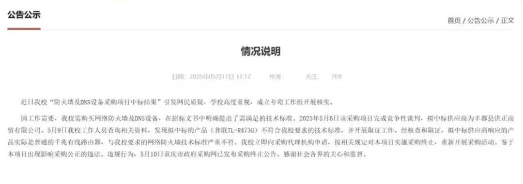 技术标准严重不符。4月27日,涉事高校在市政府采购网发布防火墙及DNS设备采购竞争性谈判公告。5月9日中标(成交)结果公告显示,主要标的防火墙产品型号为“普联TL-R473G”,而该品牌规格型号是一台普通路由器,根本不是防火墙。